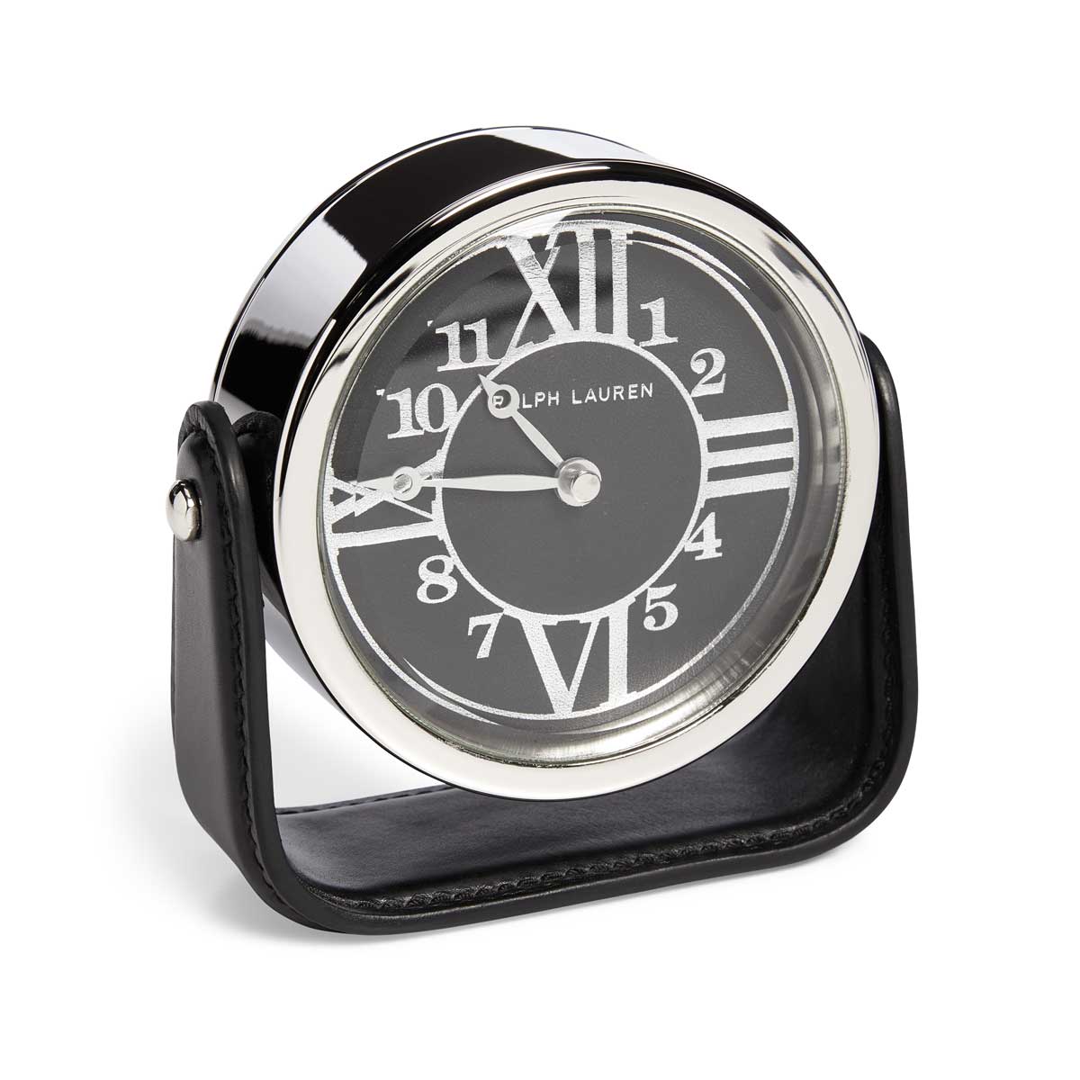 Conçu en partenariat avec la vénérable entreprise Chelsea Clock, l'horloge de bureau Brennan de Ralph Lauren Home est fabriqué aux États-Unis et s'inspire directement de la collection de montres RL888. Le cadran unique combine d'imposants chiffres romains à des chiffres arabes dans une élégante police dentelée, imprimés en métallisé brillant sur du cuir de vachette souple. Le boîtier est confectionné en laiton uni et poli pour un effet miroir. Il repose sur un support en cuir fait main, alliant une esthétique traditionnelle à une technique innovante.