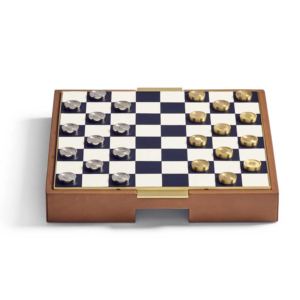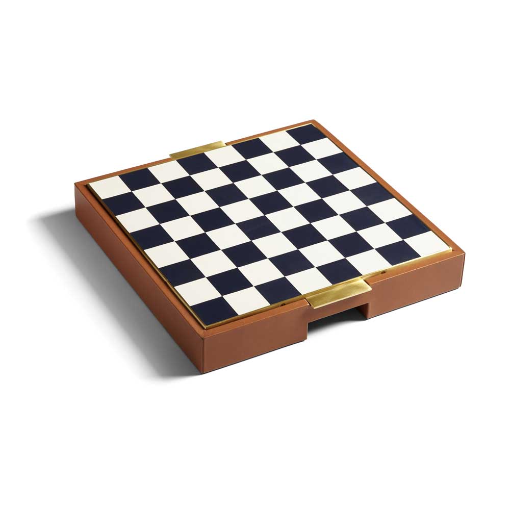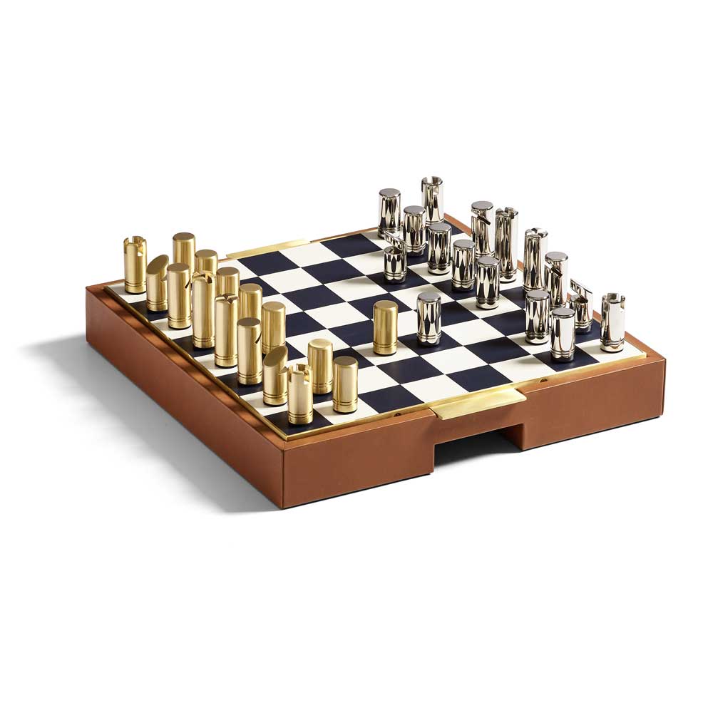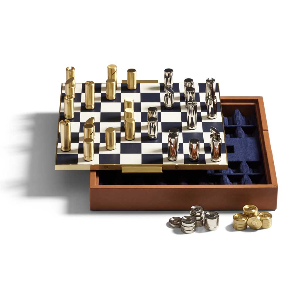 Le jeu d'échecs et Dames Fowler est entièrement fabriqué à la main, depuis les carreaux taillés dans le cuir aux coutures. Ce jeu sophistiqué célèbre textures et dimensions avec ses pièces à jouer aux finitions métallisées modernes.