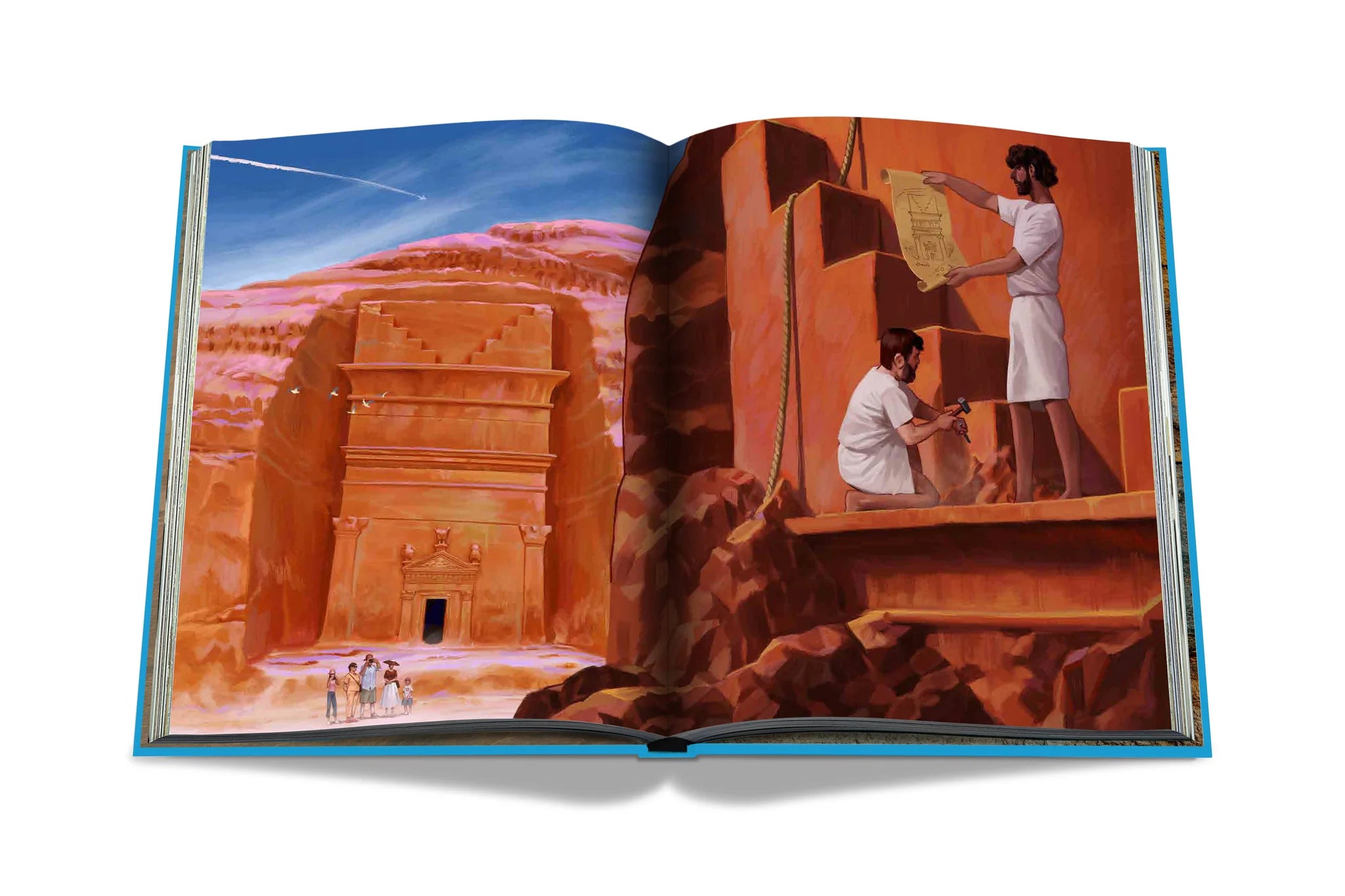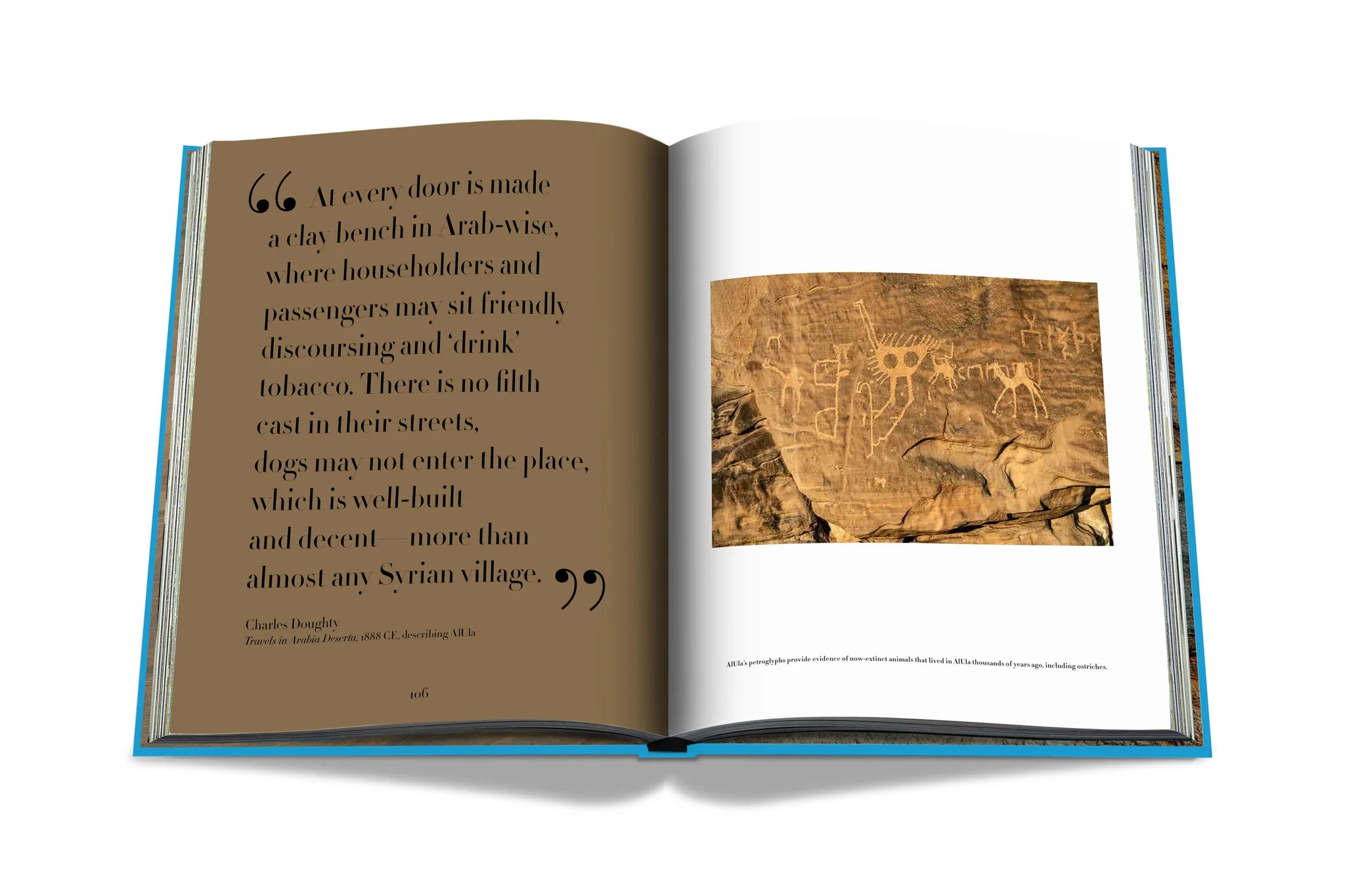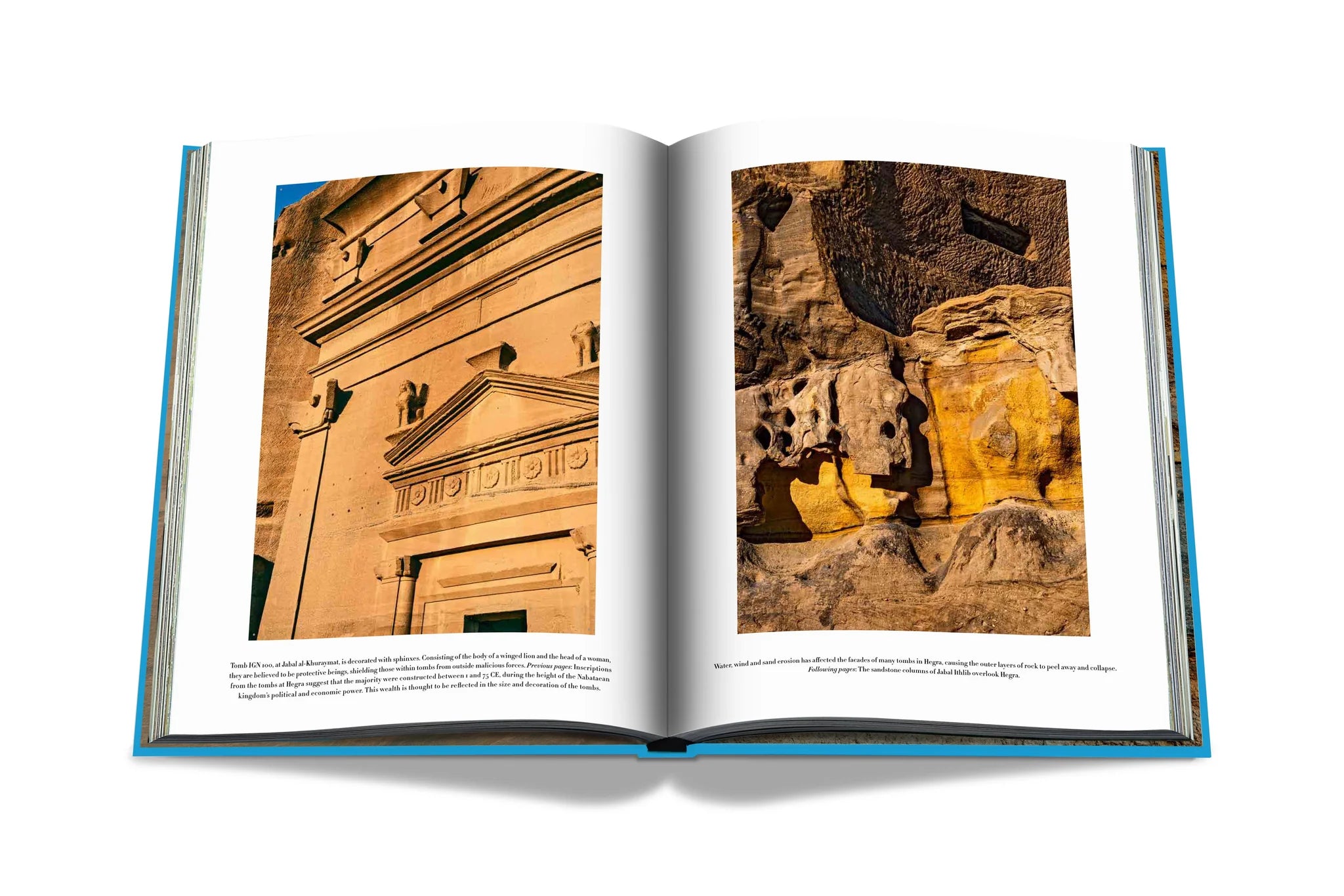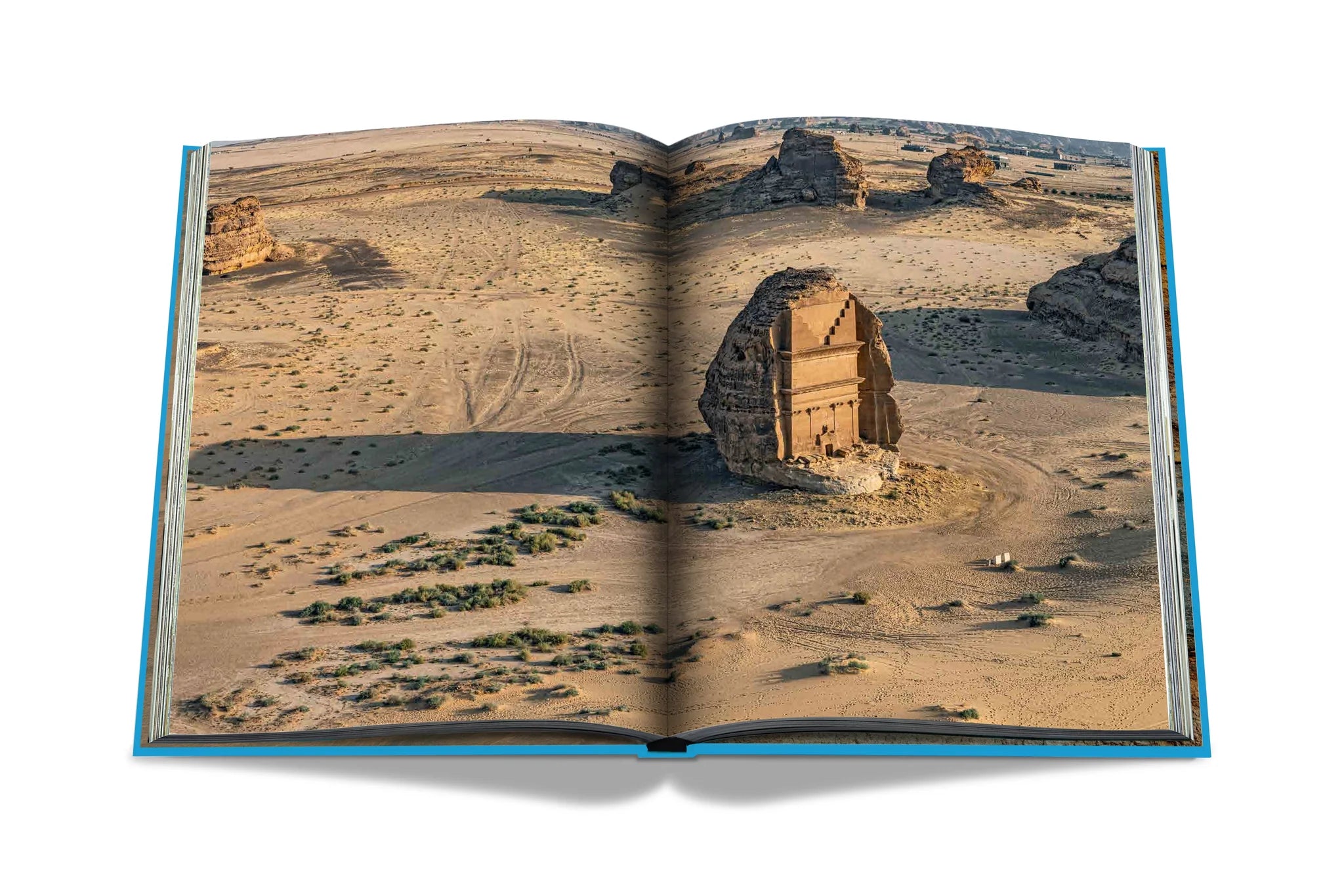 Chaque page de ce livre exclusif luxueux et en édition limitée plonge dans l'ancienne mystique de la destination, où des personnes innovantes et artistiques vivaient et voyageaient dans ses paysages exceptionnels et ses montagnes profilées, laissant des traces de leur langue, de leur culture et de leur mode de vie. Les images et illustrations capturées dans le livre incluent des tombes monumentales creusées dans les affleurements d'Hegra, des sculptures rocheuses sculptées dans la nature, notamment Jabal AlFil (également connu sous le nom de Elephant Rock) et des pétroglyphes (ou art rupestre) présentant des exemples d'animaux qui habitaient AlUla il y a des milliers d'années.