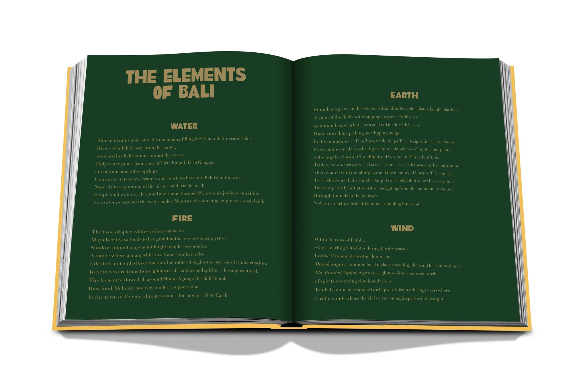 Avec des plages de sable noir, des volcans spectaculaires et d'innombrables cascades, l'abondance naturelle de Bali est inspirante. La pléthore de bambous sur l'île a favorisé le développement de l'architecture en bambou qui est maintenant très répandue. Les villas à flanc de falaise, les rizières en terrasses sans fin et la communauté animée des surfeurs se réunissent pour créer un portrait vibrant de Bali, avec la gentillesse et la chaleur de ses habitants.