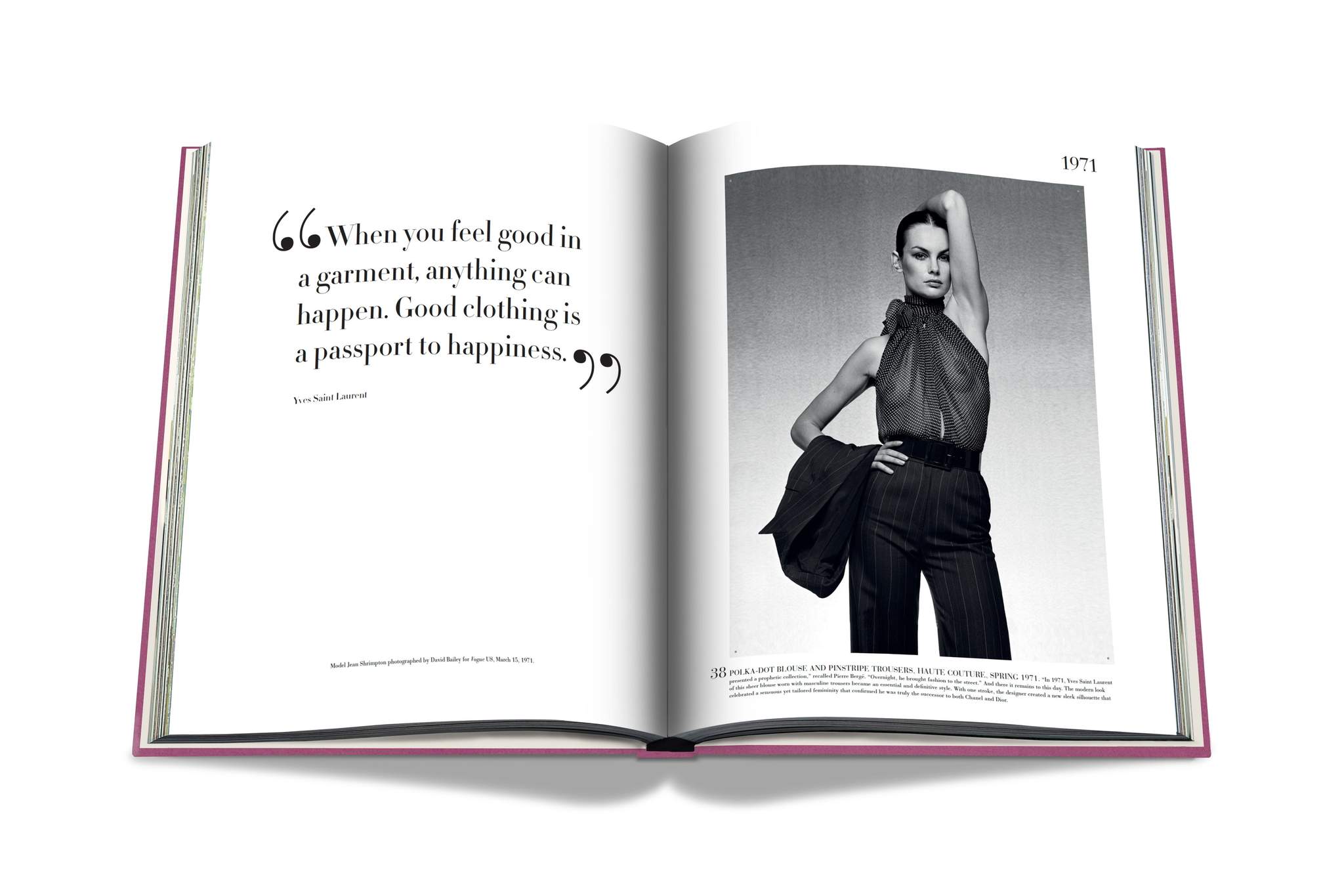 Avec Laurence Benaïm, journaliste de mode réputée et experte de Saint Laurent, Assouline a organisé les 100 pièces signatures les plus emblématiques de l'œuvre quarantenaire d'Yves Saint Laurent, des tout premiers looks apparus sur les podiums de sa première collection éponyme en janvier 1962 après son départ de Dior, à sa dernière présentation couture lors de sa retraite en 2002.