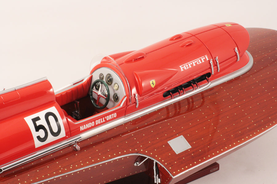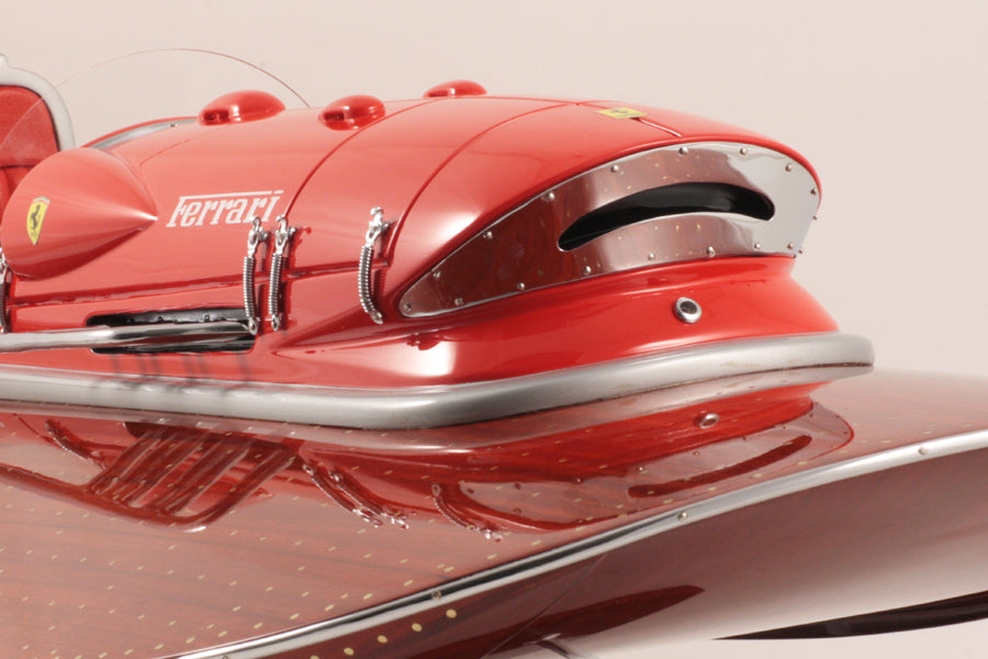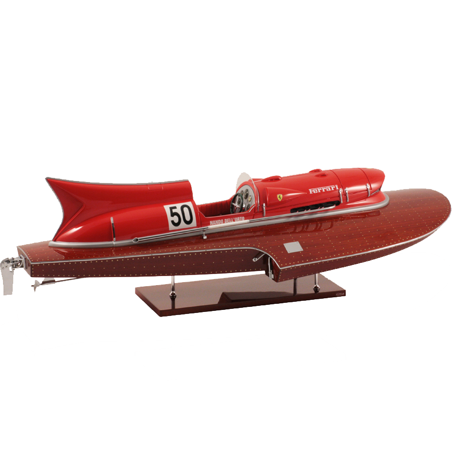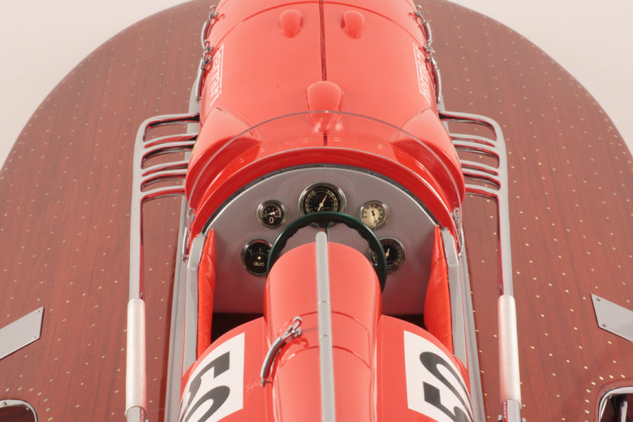 Véritable objet d’exception, cette maquette du Arno XI (moteur Ferrari) d’une longueur de 87 cm a été réalisée à l’échelle 1/7ème. Fidèle réplique du mythique hydroplane, cette maquette est entièrement réalisée à la main à partir de matériau noble : Acajou pour le bois et véritable sellerie marine. Toutes les pièces d’accastillage sont en laiton chromé réalisées sur mesure par par des bijoutiers. 10 couches de vernis sont appliquées pour obtenir une excellente brillance et profondeur de vernis.