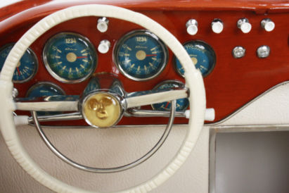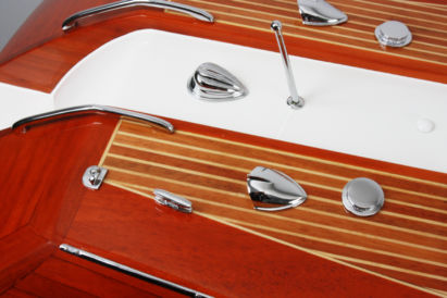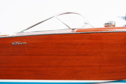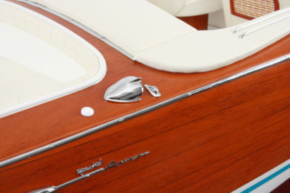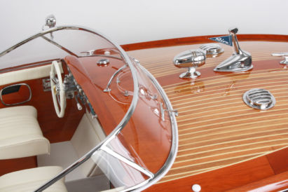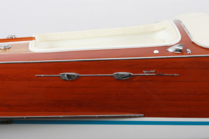 Cette maquette officielle du RIVA AQUARAMA SPECIAL, d’une longueur de 125 cm a été réalisée à l’échelle 1/7ème. Fidèle réplique du mythique Aquarama Spécial, cette maquette officielle exclusive est entièrement réalisée à la main à partir de matériau noble : Acajou pour le bois et véritable sellerie marine. Toutes les pièces d’accastillage sont en laiton chromé réalisées sur mesure par par des bijoutiers. 10 couches de vernis sont appliquées pour obtenir une excellente brillance et profondeur de vernis.
