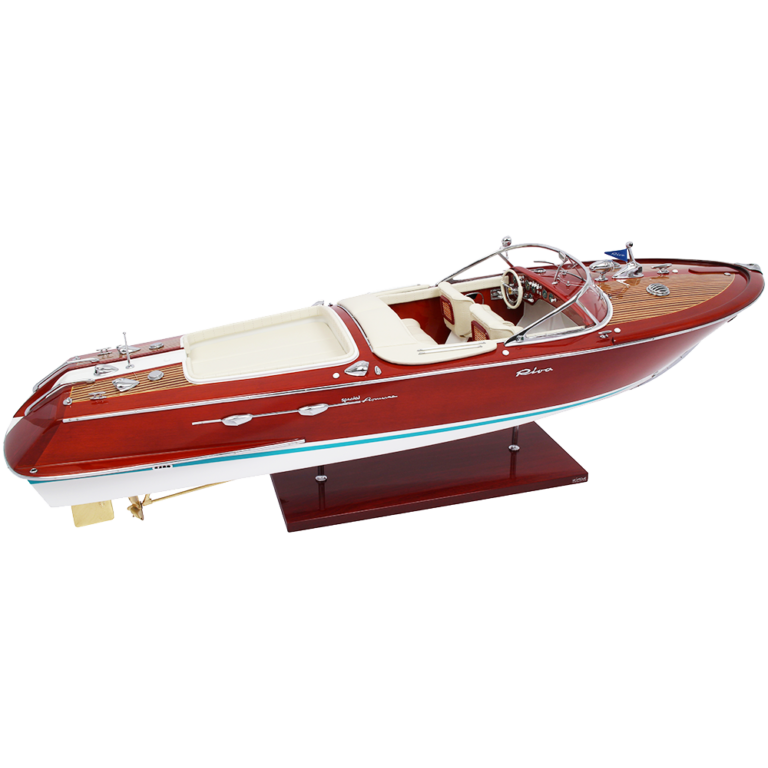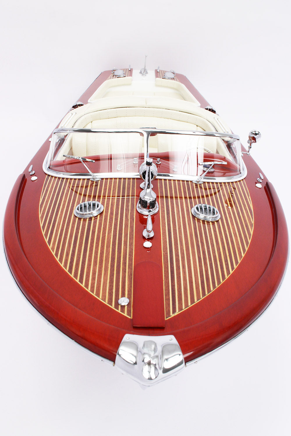 Véritable objet d’exception, cette maquette d’une longueur de 87 cm a été réalisée à l’échelle 1/10ème. Fidèle réplique du mythique Aquarama Spécial, cette maquette officielle exclusive est entièrement réalisée à la main à partir de matériaux nobles : Acajou pour le bois et véritable sellerie marine. Toutes les pièces d’accastillage sont en laiton chromé réalisées sur mesure par des bijoutiers. 10 couches de vernis sont appliquées pour obtenir une excellente brillance et profondeur de vernis.