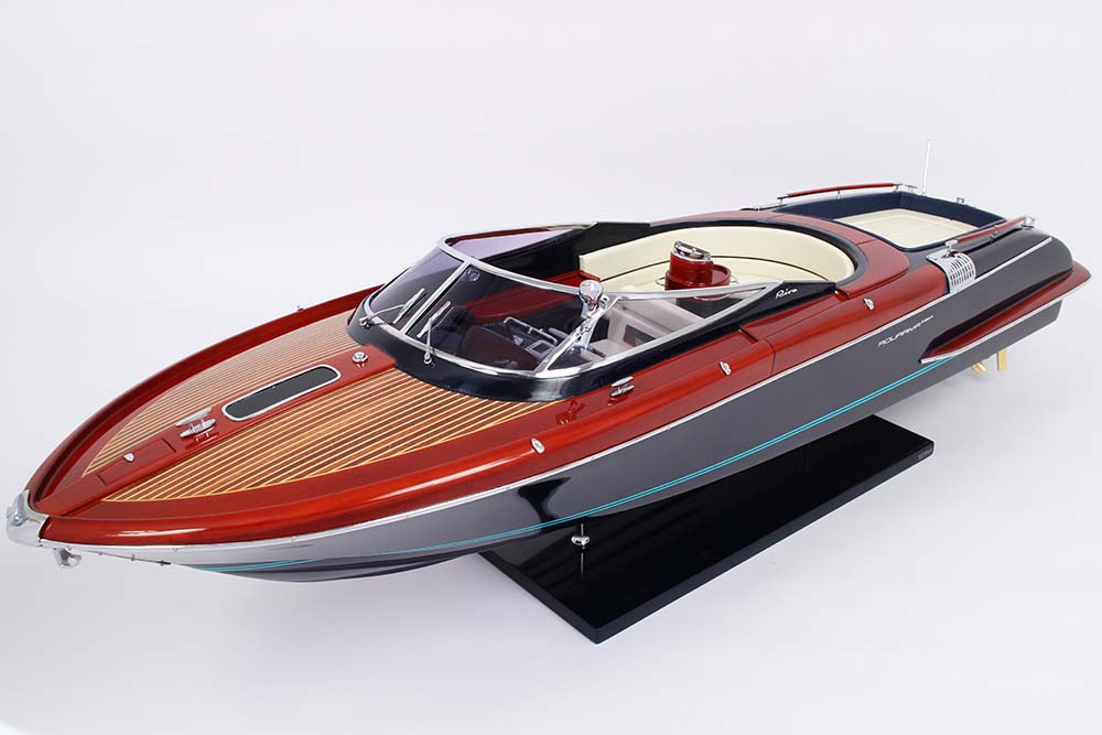 Cette nouvelle maquette de l’Aquariva Super  nouvelle version, d’une longueur de 84 cm a été réalisée à l’échelle 1/12ème. Fidèle réplique de l’élégant Aquariva, cette maquette officielle exclusive est entièrement réalisée à la main. La coque a été réalisée d’après les plans d’origine en fibre de verre et polyester. Toutes les pièces d’accastillage sont en laiton chromé réalisées sur mesure par par des bijoutiers. Une véritable sellerie marine est utilisée pour la confection des sièges et du bain de soleil. 10 couches de vernis sont appliquées sur le pont pour obtenir une excellente brillance et profondeur de vernis. Une peinture métallisé est appliquée sur la coque.