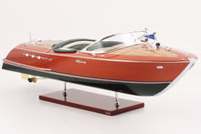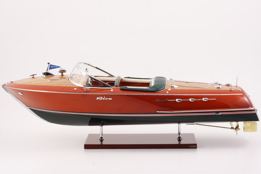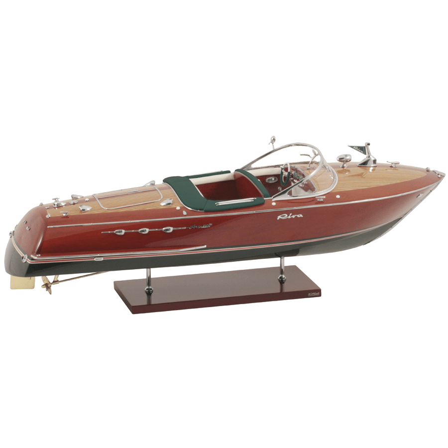 Véritable objet d’exception, cette maquette d’une longueur de 68 cm a été réalisée à l’échelle 1/10ème. Fidèle réplique de l’élégant Riva Ariston, cette maquette officielle exclusive est entièrement réalisée à la main à partir de matériau noble : Acajou pour le bois et véritable sellerie marine. Toutes les pièces d’accastillage sont en laiton chromé réalisées sur mesure par par des bijoutiers. 10 couches de vernis sont appliquées pour obtenir une excellente brillance et profondeur de vernis. Modèle proposé en sellerie verte et blanche.