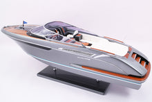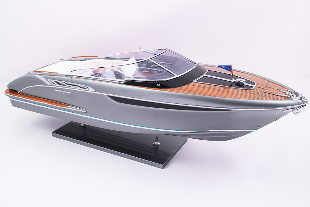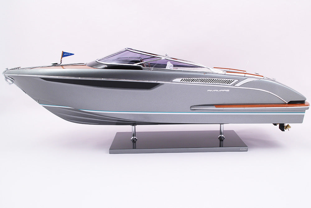 Fidèle réplique du dernier né de la gamme Riva, cette maquette est entièrement réalisée à la main. La coque a été réalisée d’après les plans d’origine en fibre de verre et polyester. Toutes les pièces d’accastillage sont en laiton chromé réalisées sur mesure par par des bijoutiers. Une véritable sellerie marine est utilisée pour la confection des sièges et du bain de soleil. 10 couches de vernis sont appliquées sur le pont pour obtenir une excellente brillance et profondeur de vernis. Une peinture métallisé est appliquée sur la coque.