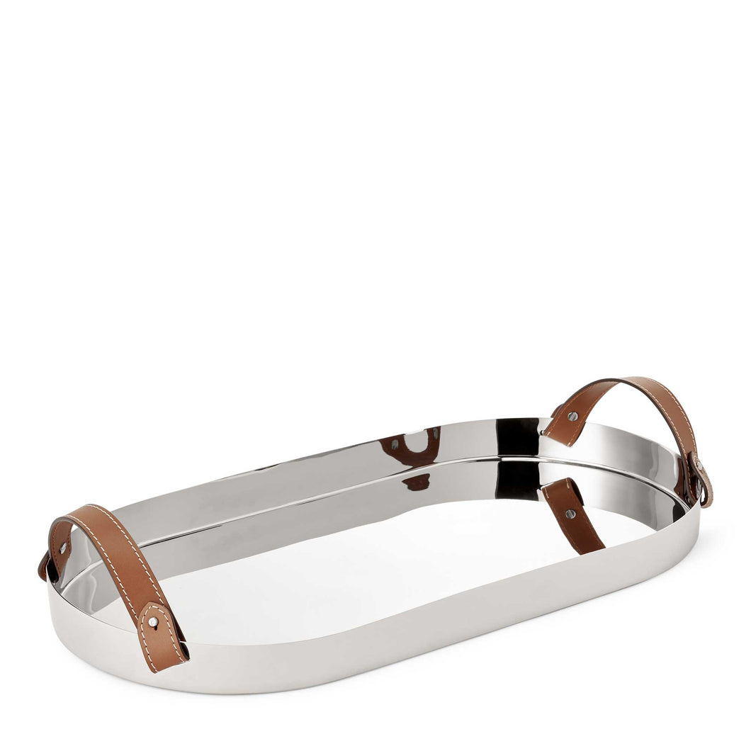 Issu de la collection Wyatt, ce plateau en acier inoxydable est rehaussé de deux poignées de cuir d'inspiration équestre.