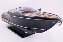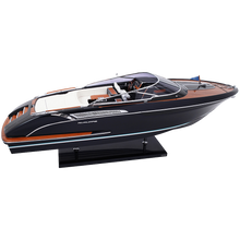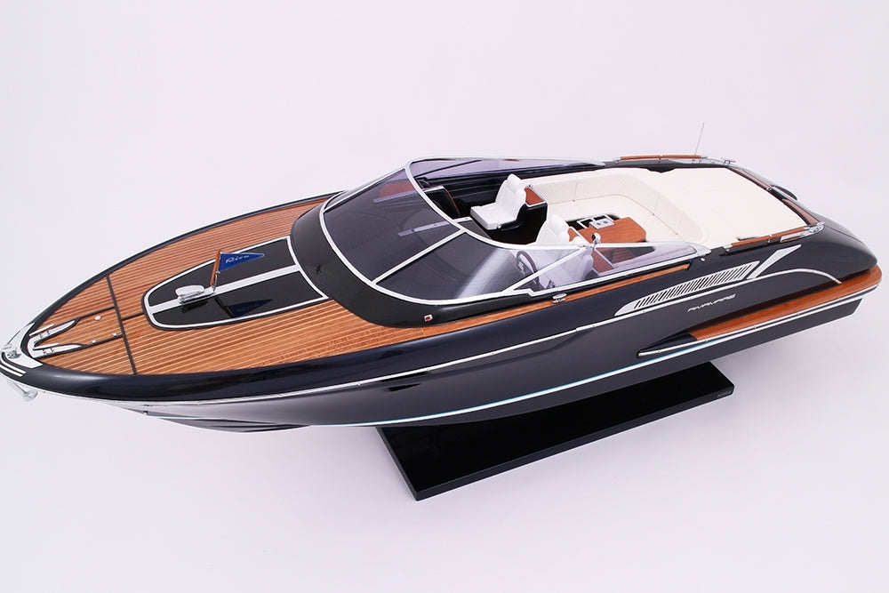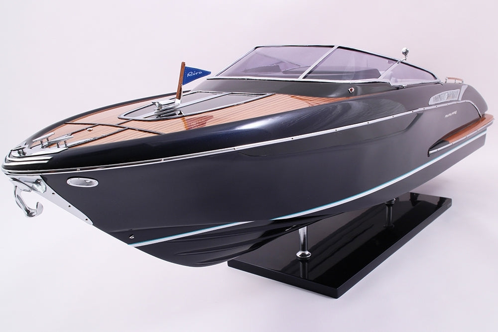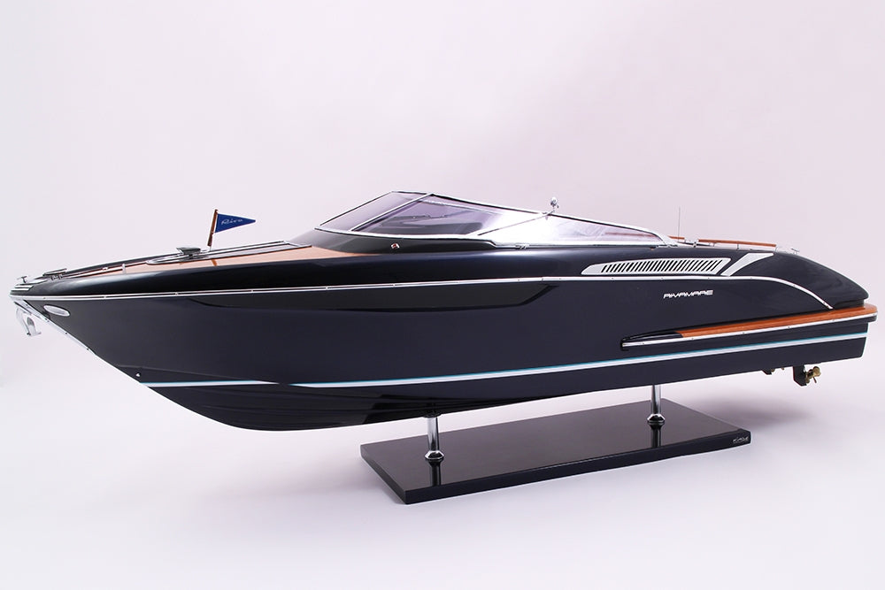 Fidèle réplique du dernier né de la gamme Riva, cette maquette est entièrement réalisée à la main. La coque a été réalisée d’après les plans d’origine en fibre de verre et polyester. Toutes les pièces d’accastillage sont en laiton chromé réalisées sur mesure par par des bijoutiers. Une véritable sellerie marine est utilisée pour la confection des sièges et du bain de soleil. 10 couches de vernis sont appliquées sur le pont pour obtenir une excellente brillance et profondeur de vernis. Une peinture métallisé est appliquée sur la coque.